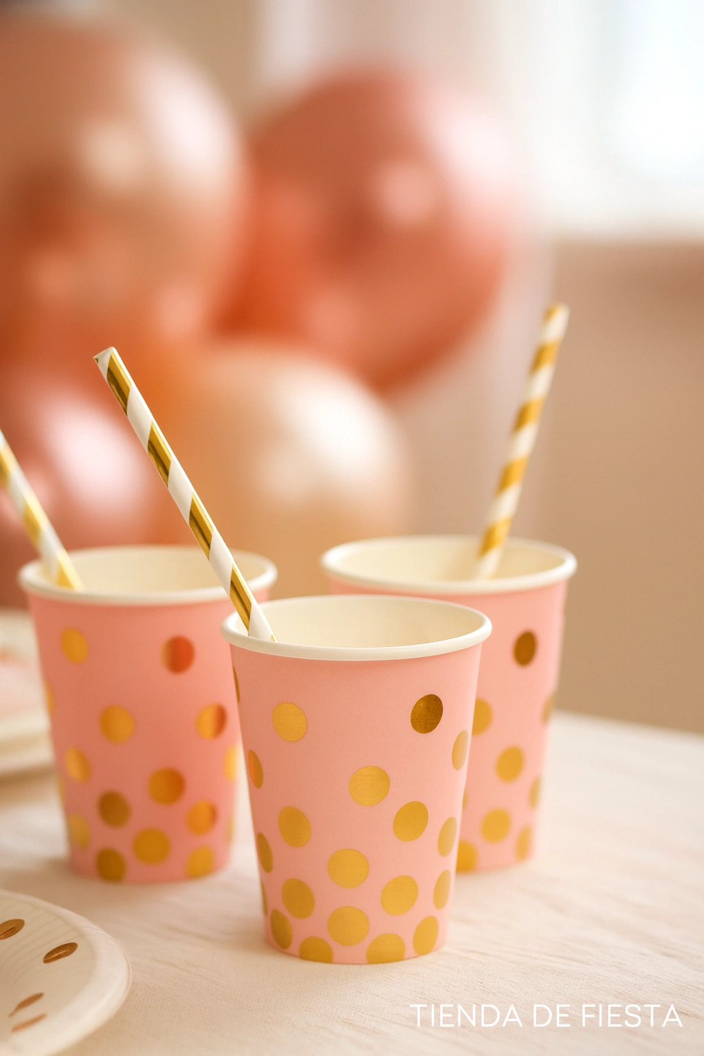 Estos vasos de polipapel de 250 cc combinan la delicadeza del color rosa con un diseño de lunares dorados que aporta un toque sofisticado a tus celebraciones.