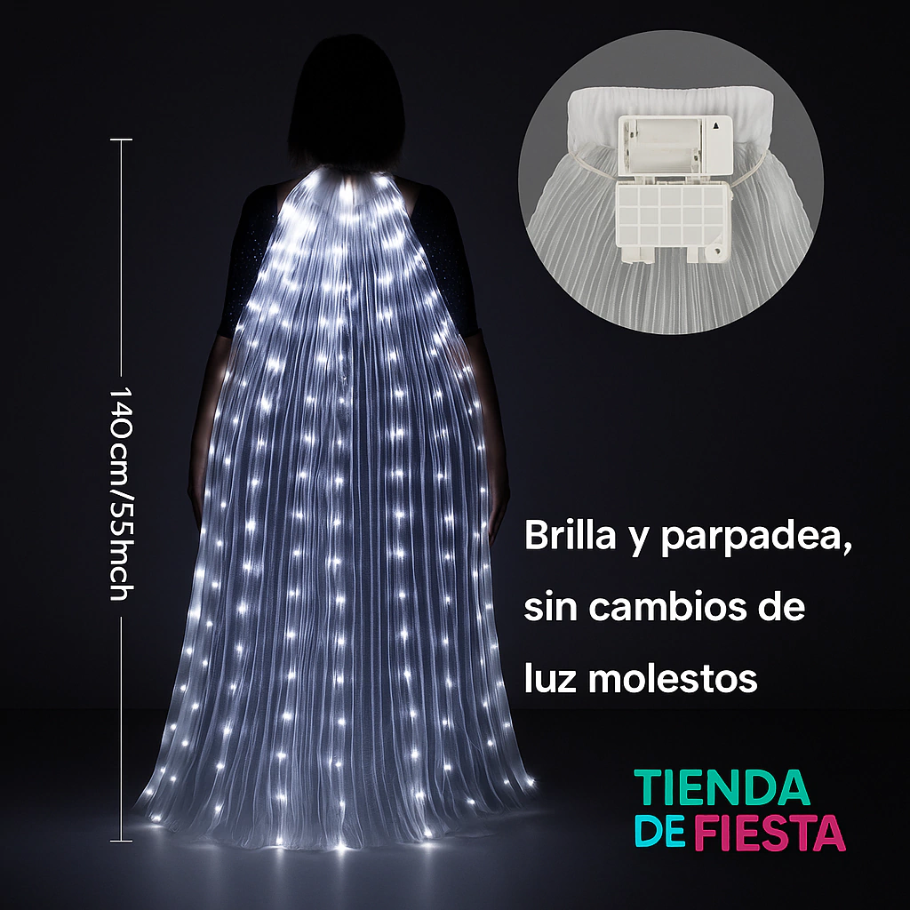 Transforma tus eventos con la Capa LED Blanca. Con una longitud extendida de 300 cm y altura de 145 cm, es ideal para personas de 150 a 175 cm. Esta capa cuenta con 120 luces LED que brindan una iluminación perfecta para cualquier ocasión.