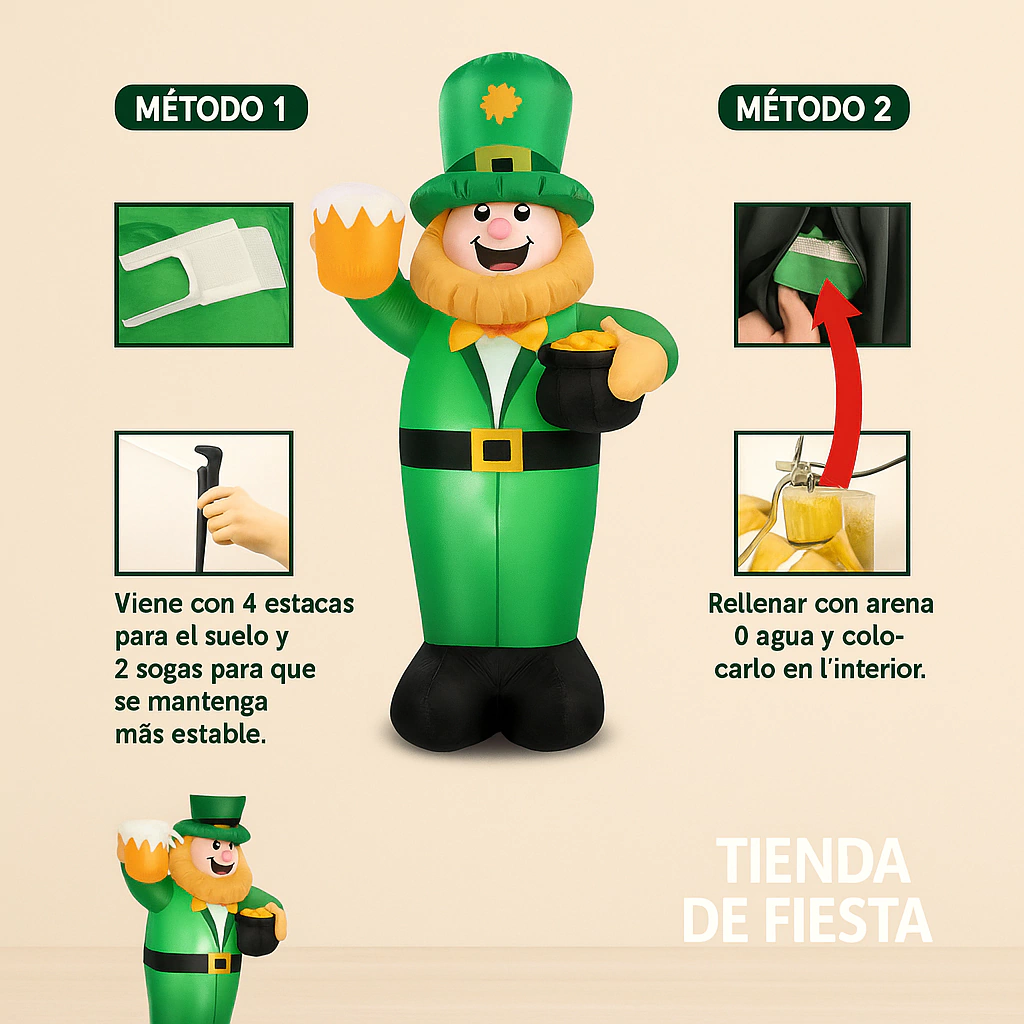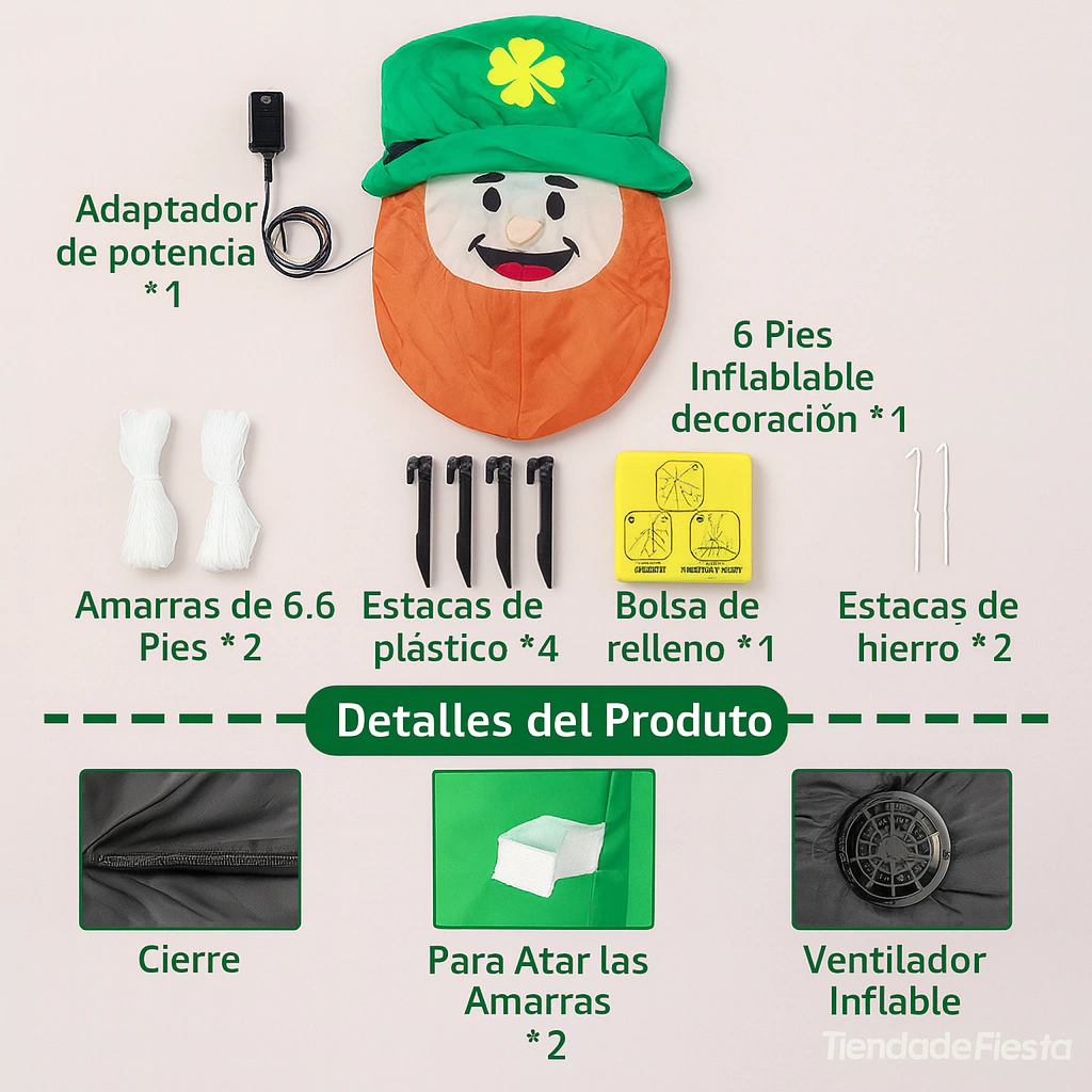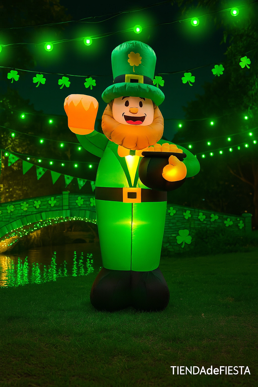 ¡Celebra San Patricio con nuestro Duende Inflable de 1.80 cm! Este encantador duende sostiene una olla dorada de cerveza y cuenta con luces LED integradas que crean un ambiente festivo.