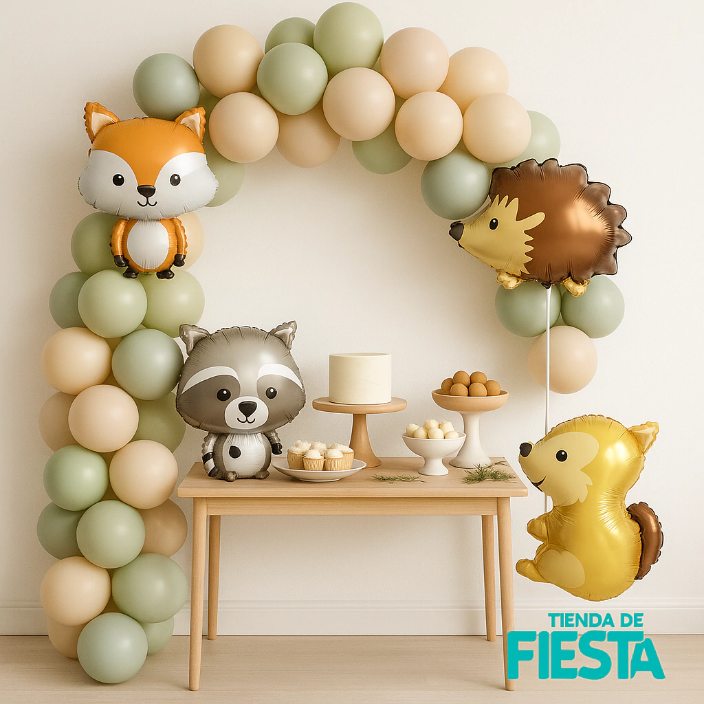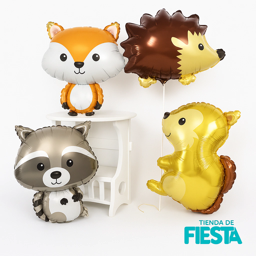 ¡Añade un toque de alegría a tus celebraciones con nuestros 4 globos animales! Este set incluye una ardilla, un mapache, un zorro y un puerco espín, cada uno con un tamaño aproximado de 70 cm.