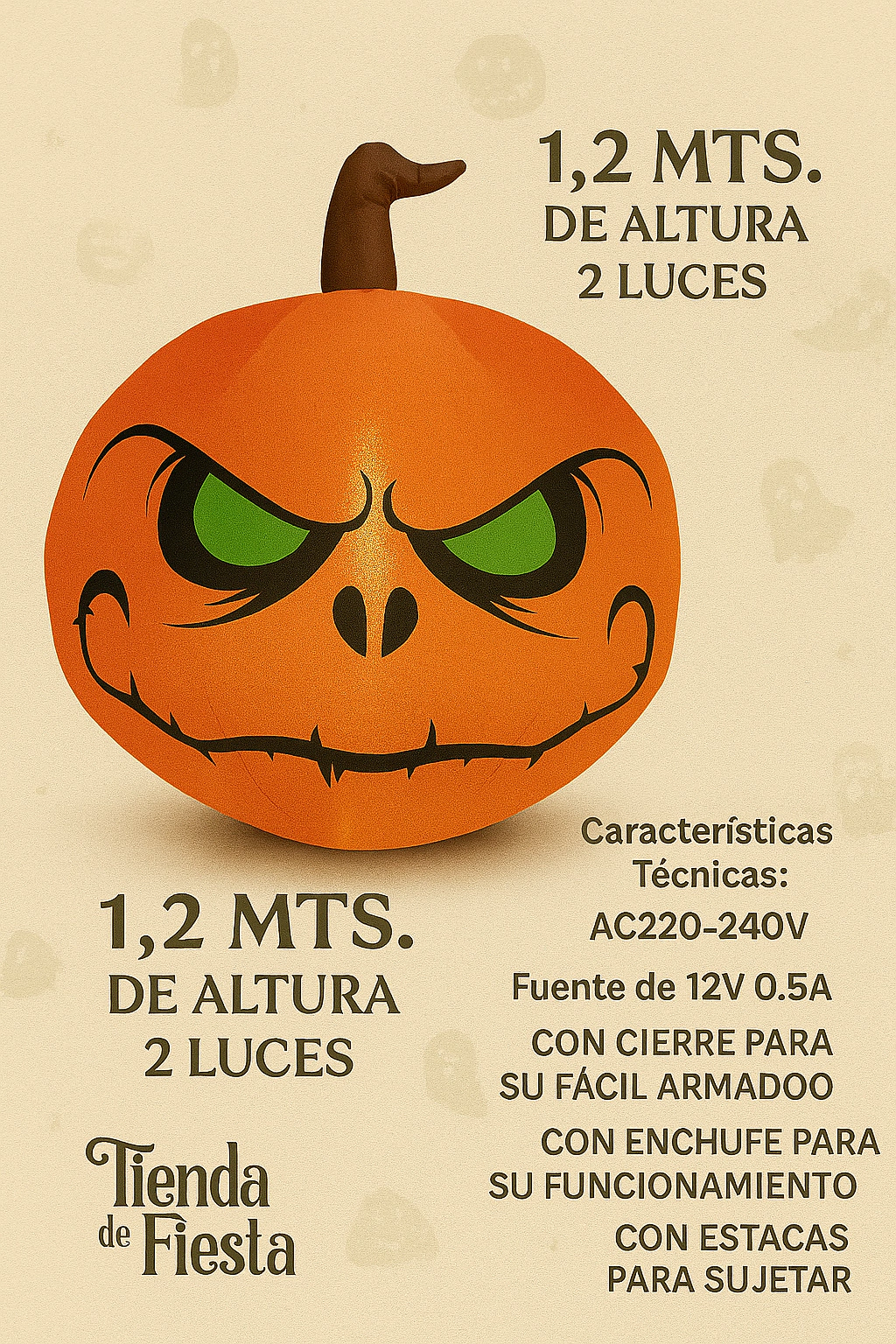 ¡Dale la bienvenida a Halloween con nuestro Inflable "calabaza"! Este adorno es ideal para decoración ambientada en Halloween, fácil de armar y perfecto para cualquier espacio. Su diseño atractivo y colorido atraerá la atención de tus invitados, creando un ambiente festivo.