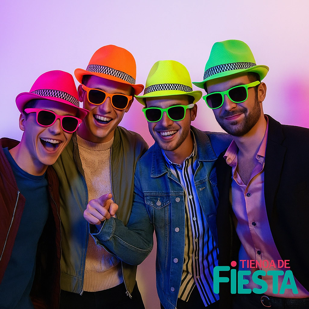 Descubre el Kit Gorras + Lentes Diamond, la combinación perfecta para destacar en cualquier evento. Este kit incluye 4 gorras fungy de tela fluo y 4 anteojos fluo, disponibles en cuatro colores vibrantes que atraerán todas las miradas.
