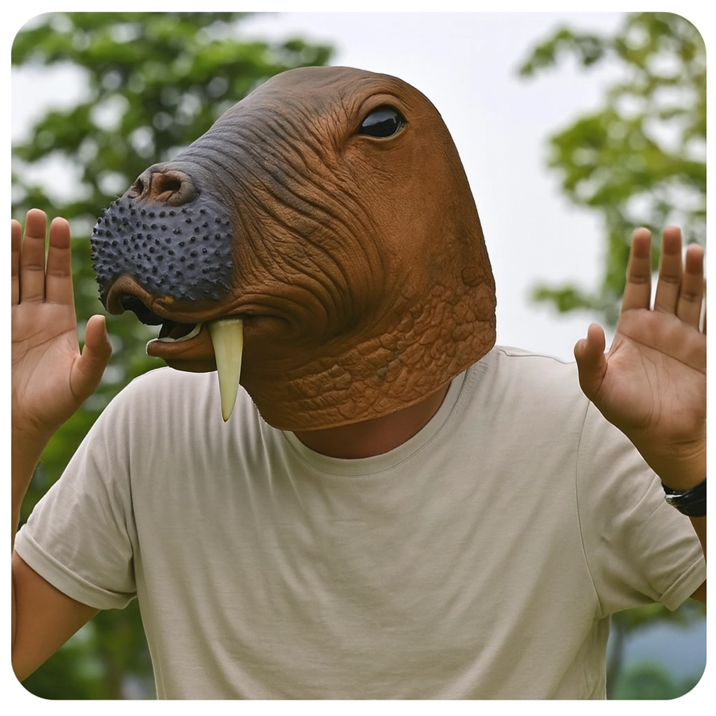 La máscara de látex de morsa es un accesorio divertido y realista, ideal para disfraces y eventos temáticos. Fabricada en látex flexible, cuenta con detalles como bigotes texturizados, colmillos prominentes y una expresión característica. Su diseño incluye aberturas para la visión y ventilación, garantizando comodidad al usarla. Perfecta para fiestas, presentaciones y coleccionistas de máscaras de animales.