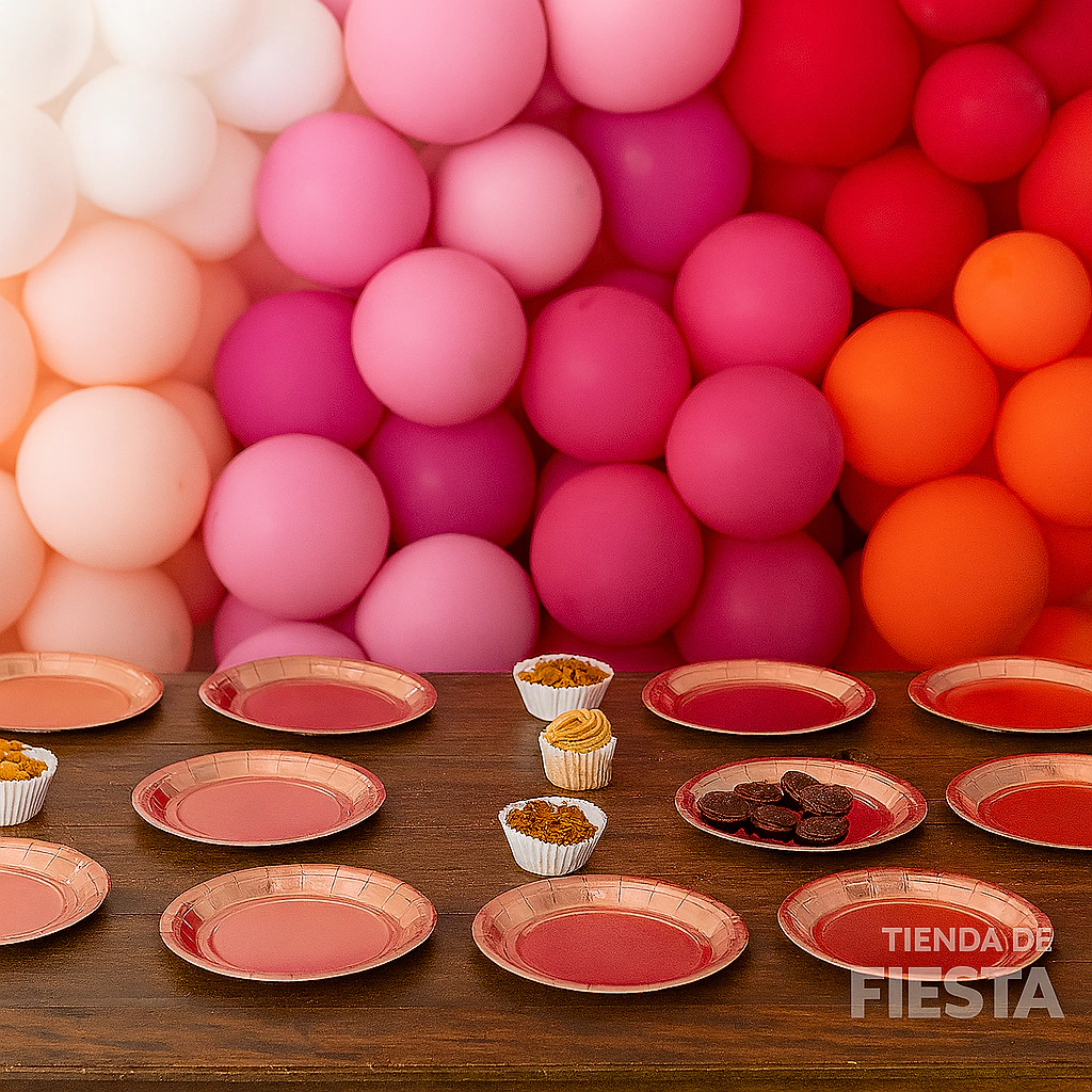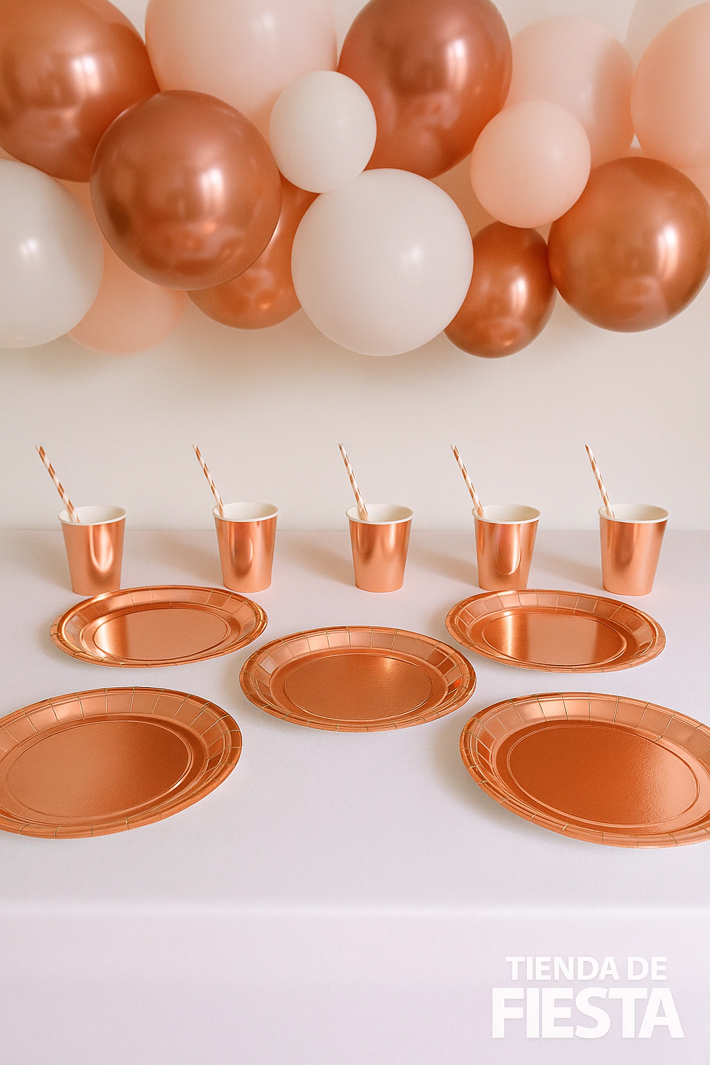 Con un diámetro de 17 cm, son ideales para tus eventos y celebraciones. Su acabado metalizado en tono rose aporta un toque elegante y moderno a tus mesas.