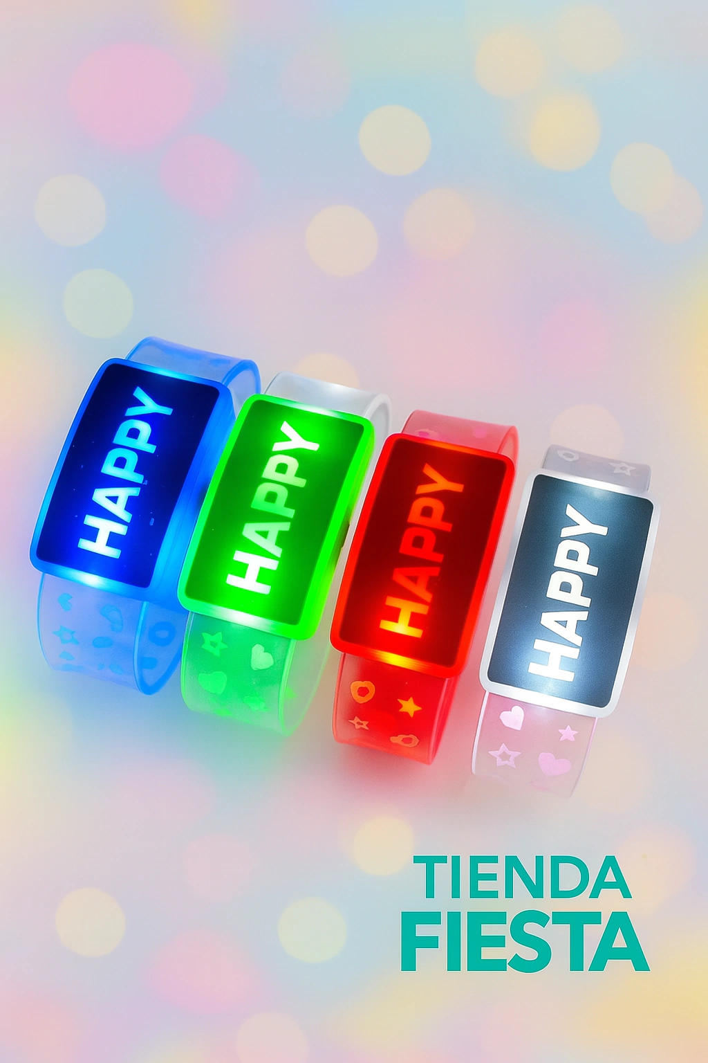 ¡Ilumina tu vida con la Pulsera Happy LED! Esta fascinante pulsera cuenta con dos modos de iluminación: fijo y titilante, para adaptarse a cada ocasión.